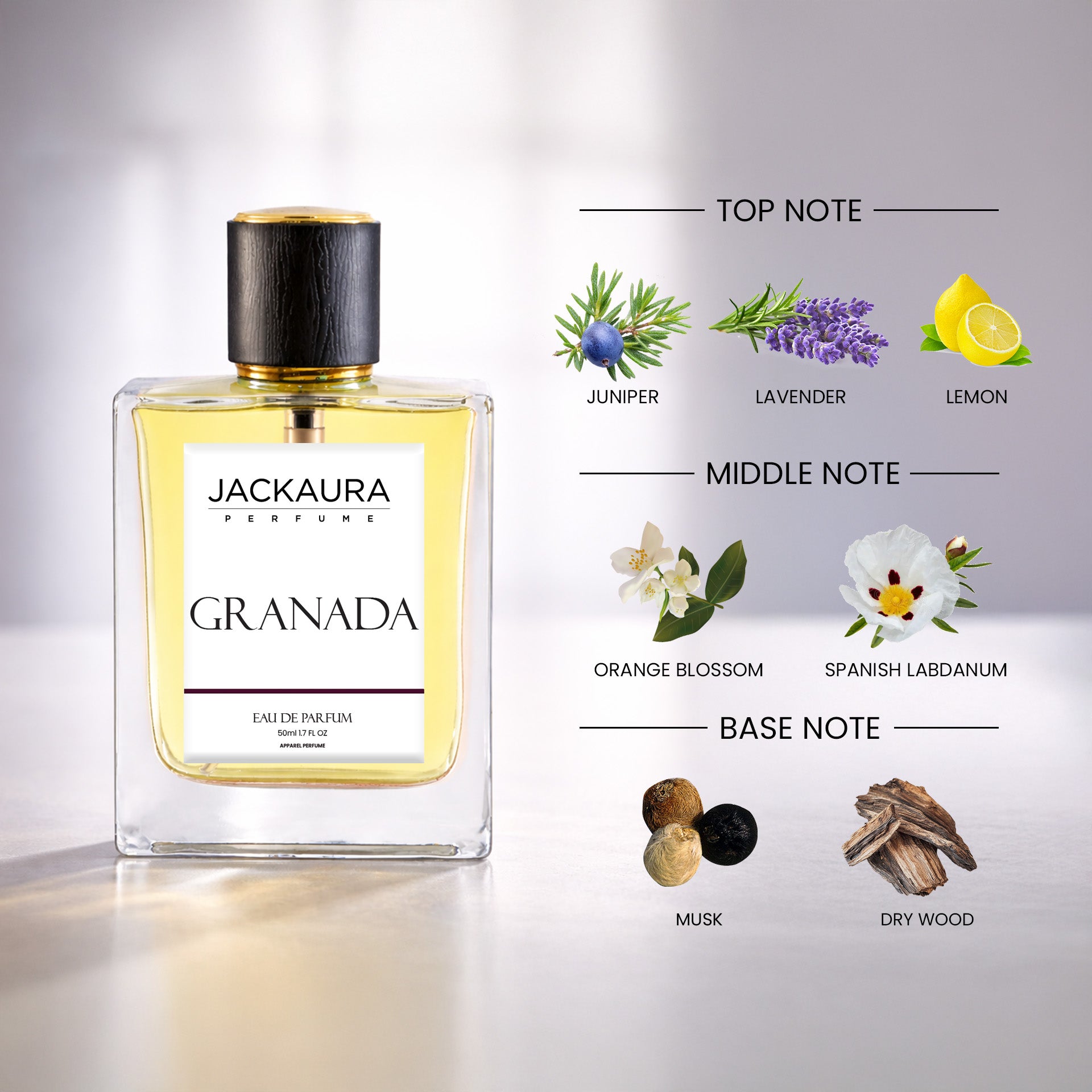 GRANADA by Jackaura is a bold and modern masculine fragrance with a rich aromatic-woody character.
